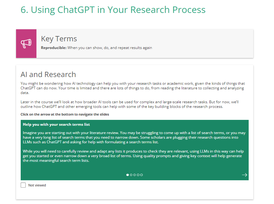 Add distinct content on ChatGPT and generative AI, rather than weave it in throughout the course. We felt adding two new topics in Module 1 would help learners discover this new content more easily and get learning right away.